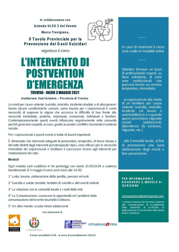 Il 3 maggio 2021 il Tavolo, in particolare il gruppo di lavoro sulle tematica della PostVention, ha dato il via al primo corso accreditato per operatori affinchè possano fornire un supporto tempestivo e immediato a sopravvissuti alla morte violenta di un caro.