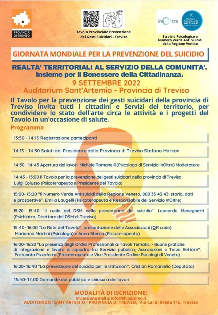 I tre incontri che si terranno nell’Autoscuola Uno di Roncade, organizzati dal Comune di Roncade, l’Azienda ULSS 2, Cittadinanzattiva, il Tavolo Provinciale per la Prevenzione dei Gesti Suicidari e La Rete di Malachia e dai proprietari dell’autoscuola stessa.